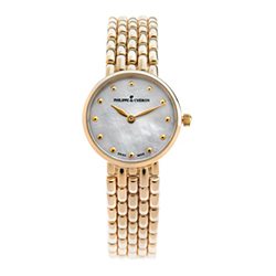 3. Philippe de Cheron Elisa oval quartz 5002.1213N Корпус – жёлтое золото 14 карат, размеры – 21,5x24мм, толщина – 5,5мм. Браслет – жёлтое золото 14 карат. Общий вес золота – 40,2 г. Сапфировое стекло. Водонепроницаемость 3 атм. (30 м). Механизм – кварцевый «Ronda 751». Циферблат – белый, перламутровый, золотые стрелки и часовые метки. |