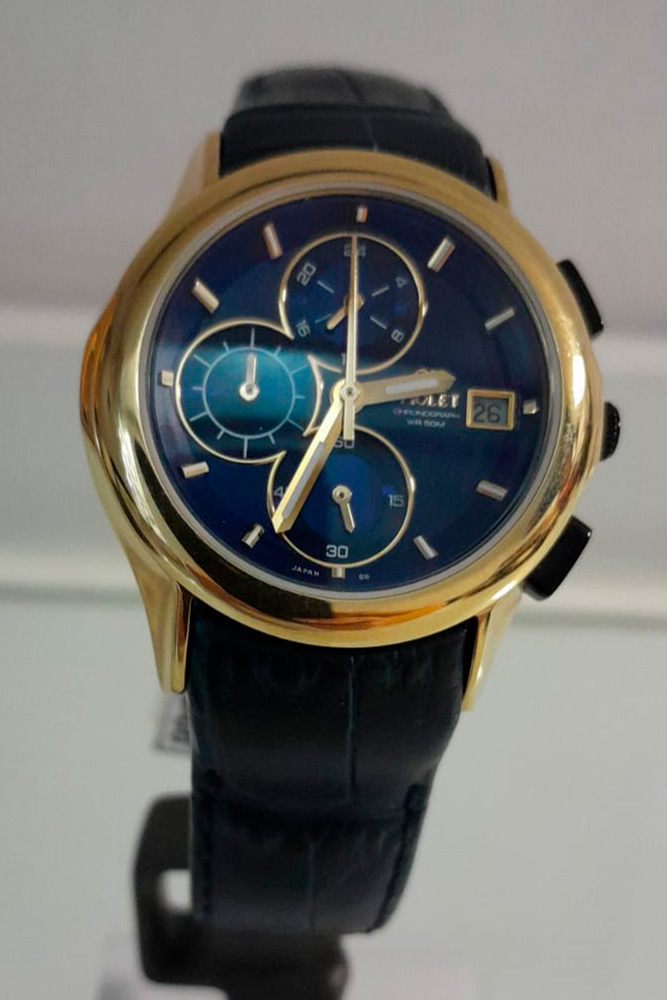 Корпус: Корпус выполнен из высококачественной стали с повышенной устойчивостью к коррозии, поверхность с полировкой до зеркального блеска и частичным IP -покрытием. Синий циферблат. Накладные часовые индексы и стрелки выполнены из стали с позолотой. На стрелках покрытие SuperLuminova, которое обеспечивает подсветку в темное время суток. Сапфировое стекло устойчивое к возникновению царапин. Диаметр корпуса составляет: 35 мм. Водостойкость: WR 50 (мытье рук, дождь).