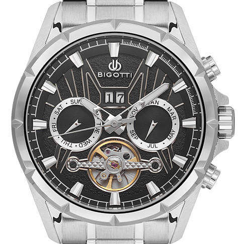 Функции: Индикация часов, минут и секунд при помощи центральных стрелок. На малых циферблатах отображается день недели, месяц. Дата.