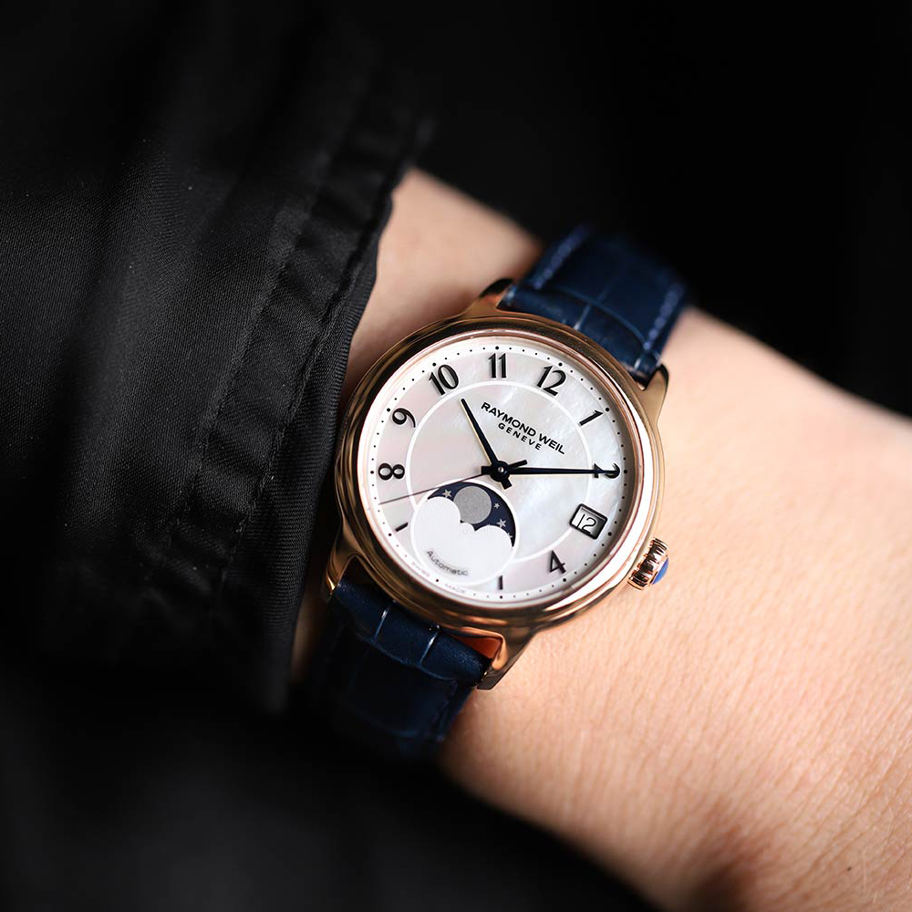 Корпус: Корпус круглой формы выполнен из нержавеющей стали марки 316L с PVD-покрытием цвета розового золота. Циферблат из натурального перламутра, метки в виде арабских цифр. Сапфировое стекло имеет повышенную устойчивость к возникновению царапин. Прозрачная задняя крышка с сапфировым стеклом. Рифленая заводная головка украшена синим лаком. Диаметр корпуса 34 мм, толщина 9,4 мм. Водостойкость на глубине до 50 метров.