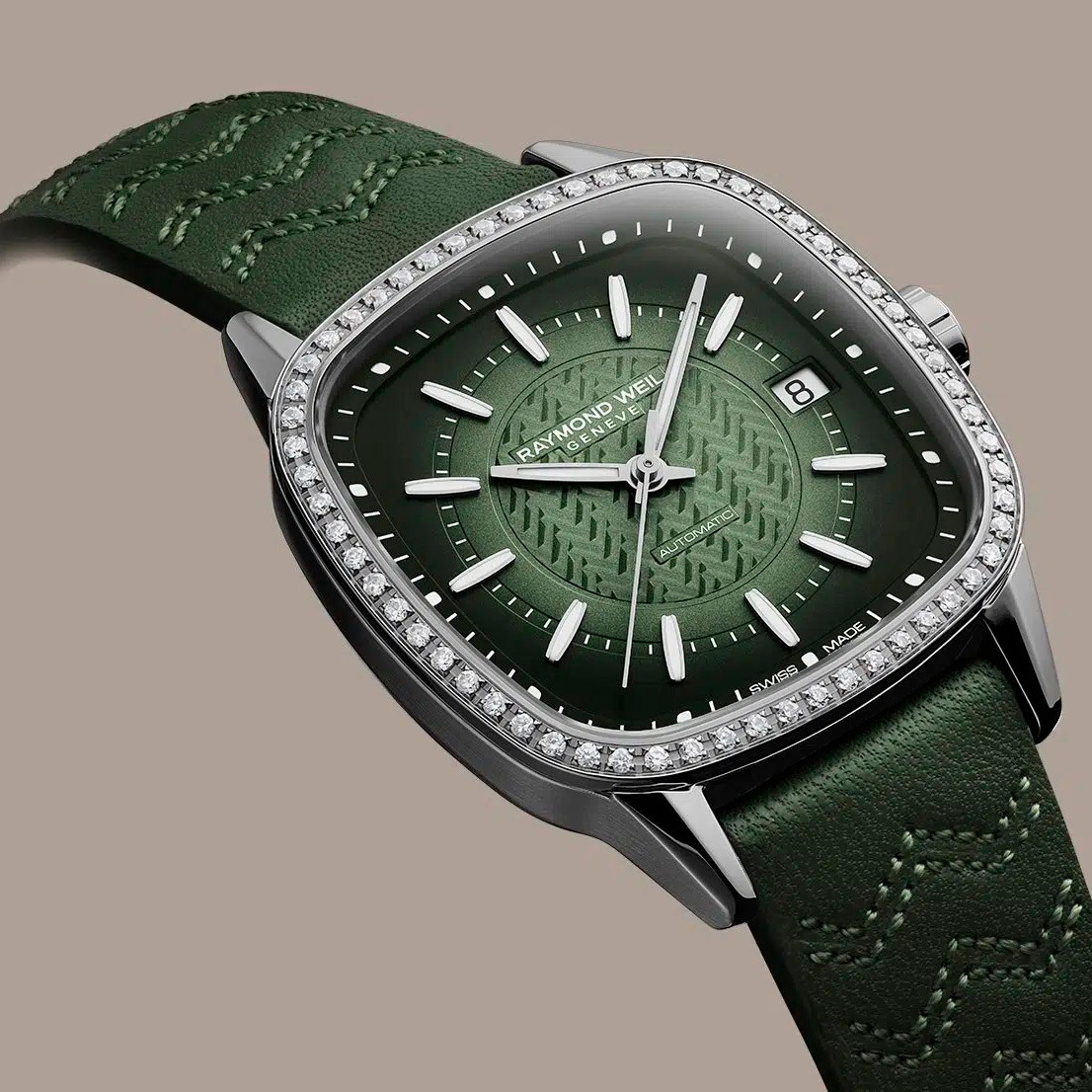 Ремешок: Кожаный ремешок зулёного цвета с раскладывающейся застежкой. Застежка с двойной системой защиты, украшена гравировкой Raymond Weil.