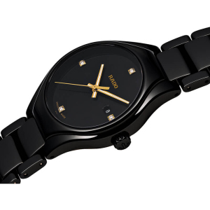 Корпус: Высокотехнологичная керамика черного цвета. Сапфировое стекло. Диаметр 30 мм, водонепроницаемость 50 метров. Циферблат черный, украшен 4 бриллиантами общим весом 0.032 ct.