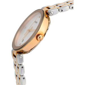Корпус: Нержавеющая сталь с частичным PVD-покрытием розового золота. Металлик циферблат с золотистыми стрелками и часовыми индексами, декорирован 4 бриллиантами. Сапфировое стекло. Диаметр 28 мм. Водонепроницаемость 30 метров.