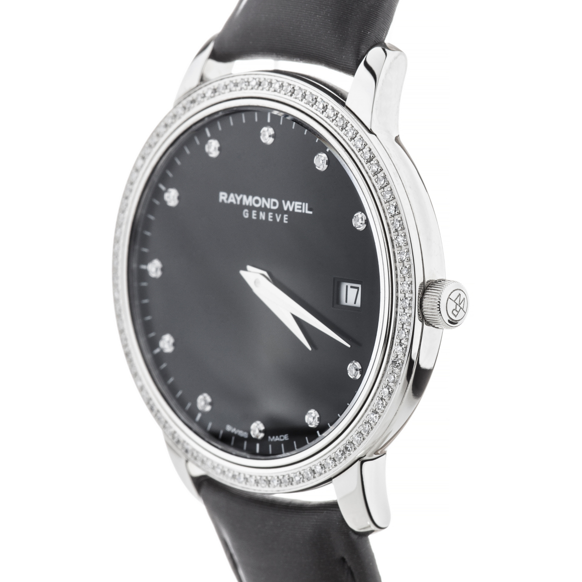 Корпус: Корпус изготовлен из нержавеющей полированной стали, украшен 79 бриллиантами. Чёрный циферблат с условными часовыми бриллиантовыми индексами. Серебристые стрелки. Сапфировое стекло с антибликовым покрытием. Диаметр 34 мм. Водостойкость 50 м.