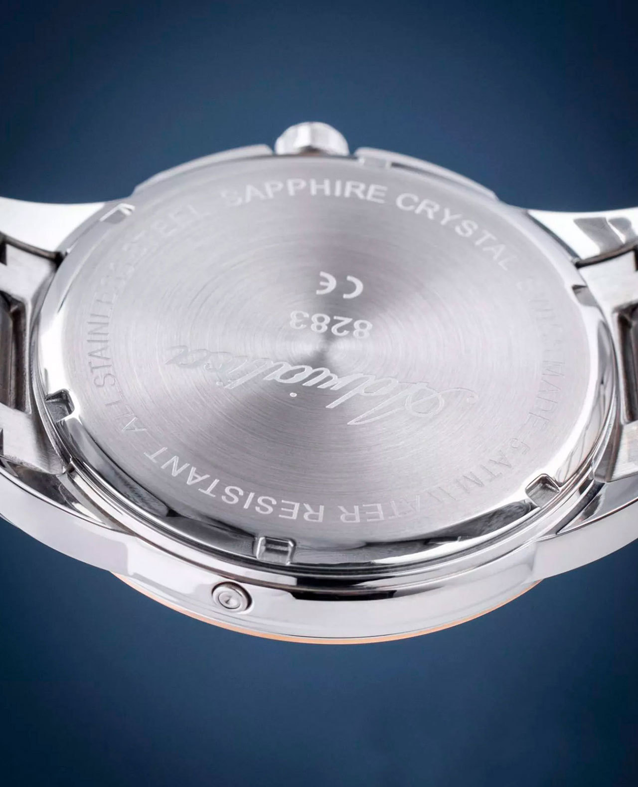 Корпус: Корпус выполнен из высококачественной стали с повышенной устойчивостью к коррозии, поверхности с матовой шлифовкой – сатинированием и полировкой до зеркального блеска с частичным PVD-покрытием. Чёрный циферблат с узором гильоше. Накладные часовые индексы и срелки выполненый из стали с покрытием. Стрелки с покрытием SuperLuminova, которое обеспечивает подсветку в темное время суток. Сапфировое стекло устойчивое к возникновению царапин. Диаметр корпуса составляет 45 мм, толщина 10 мм. Водостойкость WR 50 (мытье рук, дождь).