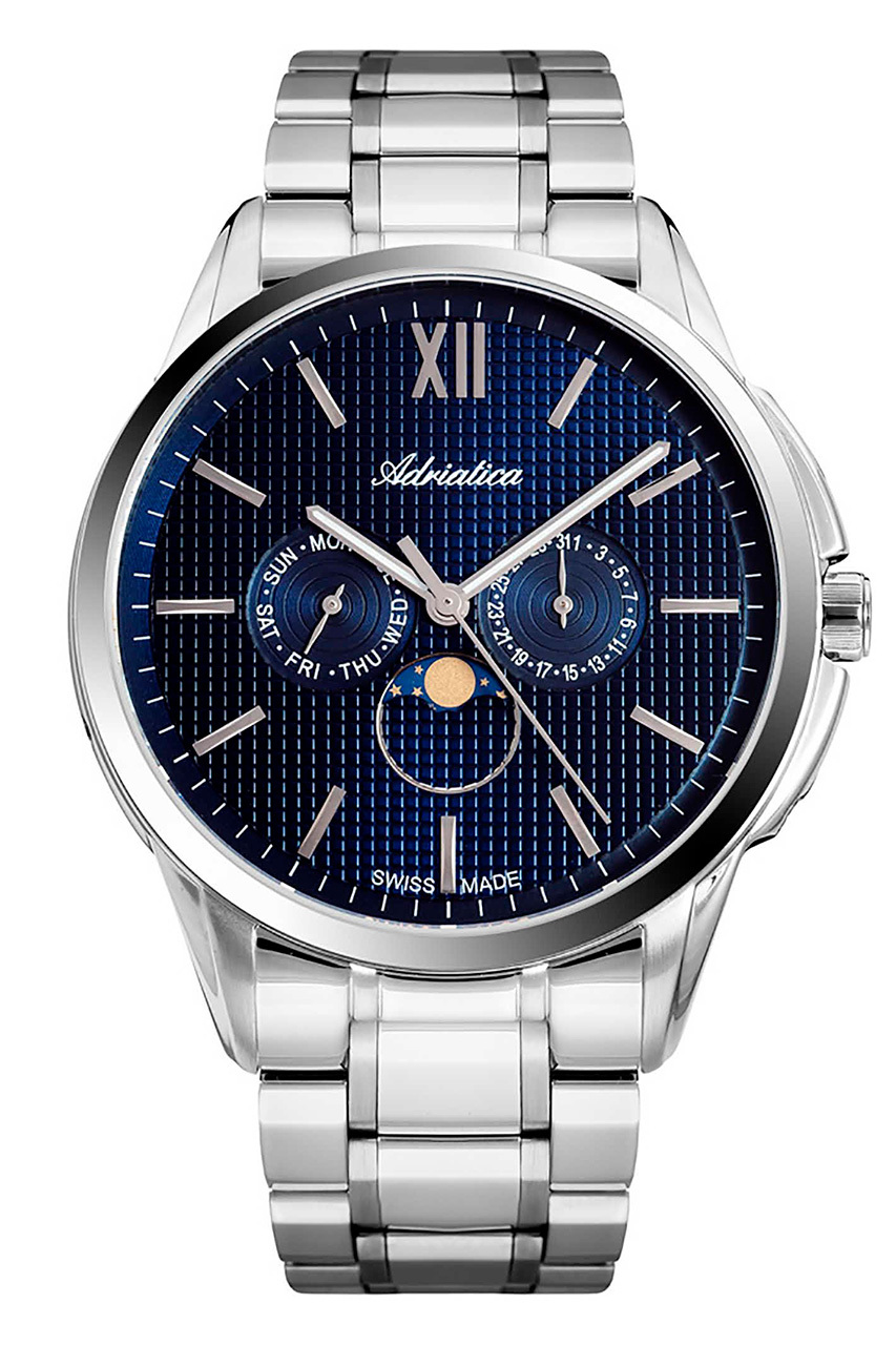 Корпус: Круглый корпус выполнен из полированной нержавеющей стали. Серебристый циферблат с узором гильоше. Накладные часовые индексы и стрелки выполнены из стали с покрытием синего цвета. Стрелки с покрытием SuperLuminova, которое обеспечивает подсветку в темное время суток. Сапфировое стекло устойчивое к возникновению царапин. Диаметр корпуса составляет 45 мм, толщина 10 мм. Водостойкость WR 50 (мытье рук, дождь).