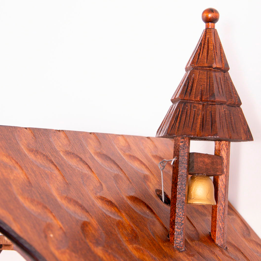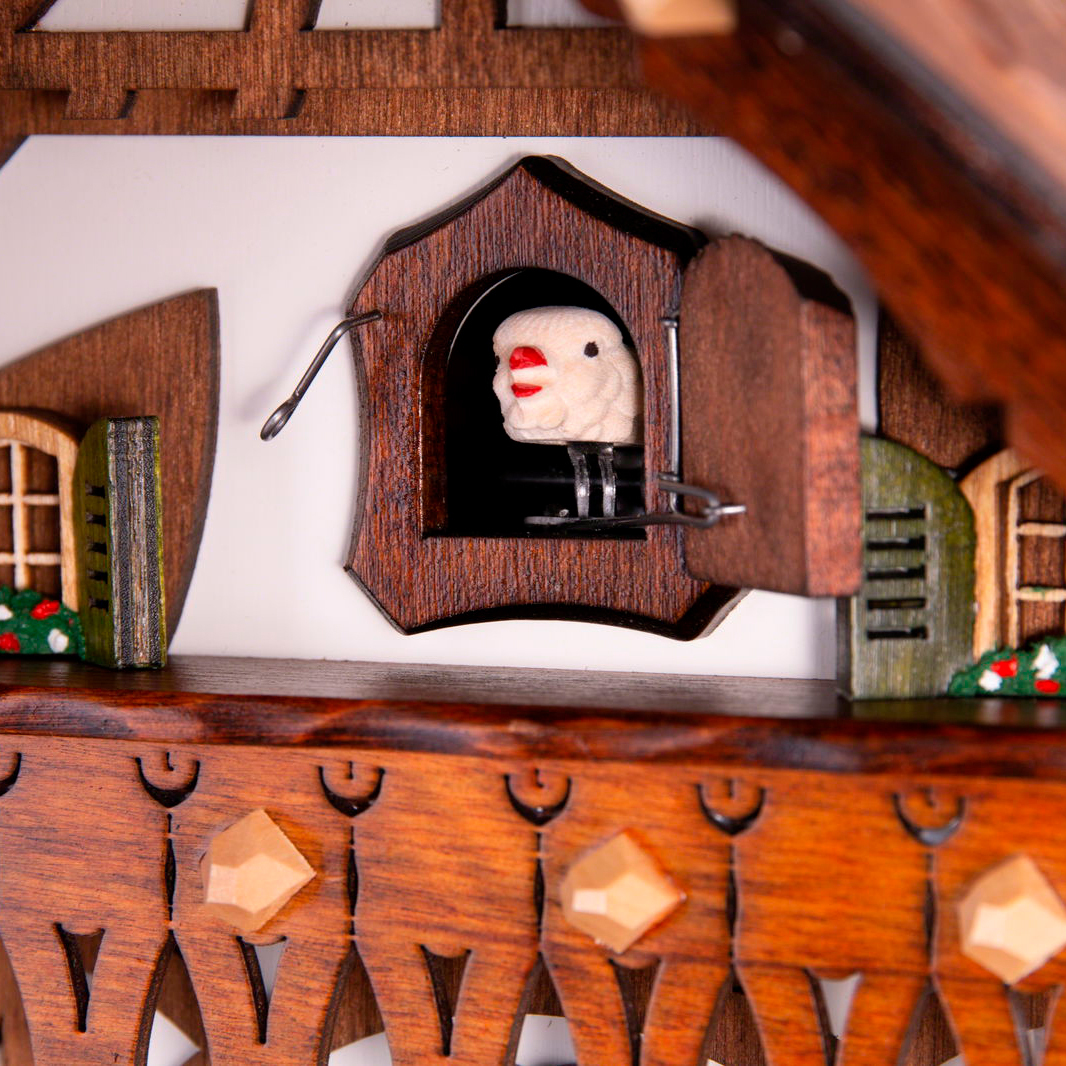 Механизм: Механические часы с кукушкой, которые работают от гирь на цепной тяге. Сделан на фирме SBS-Feintechnik GmbH & Co. KG Германия. Шварцвальдский дом со звонарём. Запас хода на 8 дней. Ручное отключение звука. В каждые пол часа кукушка появляется из своего домика, наклоняется и воспроизводит звук кукушки (ку-ку) один раз, в каждый полный час она кукует столько раз сколько показывают стрелки на часах. Одна гиря отвечает за ход часов, вторая за работу механизма кукушки и звоноря.