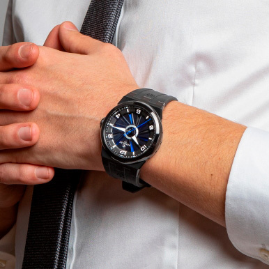 Корпус: Круглый корпус выполнен из высокосортной нержавеющей стали с полировкой и матовой шлифовкой (сатинированием) поверхностей. Стойкое к царапинам PVD покрытие черного цвета. Циферблат с видимым ротором автоподзавода чёрного цвета. Поверхность циферблата под вращающимся в двух направлениях роторе имеет биколорную расцветку с сегментами синего и черного цветов. Аппликация цифр, часовых индексов и стрелки с покрытием родием. Люминесцентный состав светящийся в темноте. Сапфировое стекло имеет антибликовое покрытие с обеих сторон. Диаметр корпуса 44 мм, толщина - 13 мм. Заводная коронка украшена миниатюрой с эмблемой марки. Задняя крышка с прозрачным стеклом. Водостойкость 50 метров.