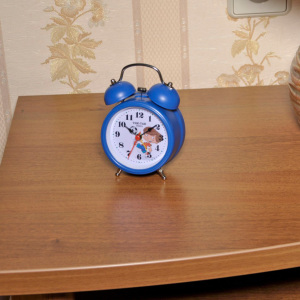 Материал и цвет: Корпус будильника изготовлен из пластика, к которому крепятся два металлических колокольчика, окрашенных в цвет корпуса. При звонке молоточек ударяет по колокольчикам. Стекло – минеральное.