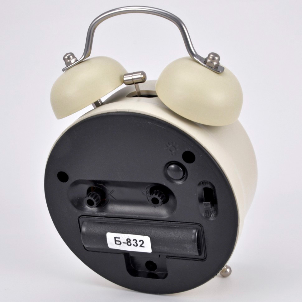 Материал и цвет: Корпус будильника изготовлен из пластика, к которому крепятся два металлических колокольчика, окрашенных в цвет корпуса. При звонке молоточек ударяет по колокольчикам. Стекло – минеральное.