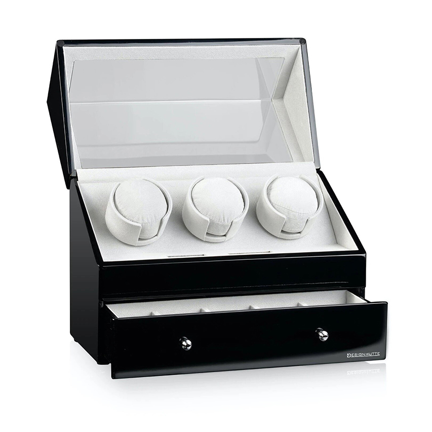 Механизм: Шкатулка оснащена мощным двигателем с бесшумным ходом и достаточно длительным сроком эксплуатации. Завод механизма часов осуществляет двигатель, совершающий поочерёдное вращение по часовой стрелке, против часовой стрелки и вращение в двух направлениях со скоростью 650, 900, 1200, 1500 оборотов в день. На жидкокристаллическом дисплее, созданном по эксклюзивной технологии, отражена функция контроля работы двигателя. Энергия для двигателя и жидкокристаллического дисплея поступает от сети переменного тока через входящий в комплект адаптер.