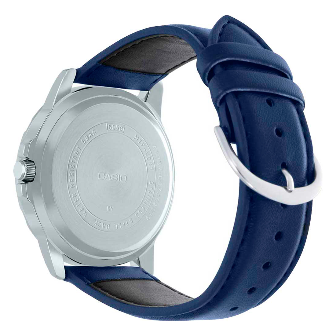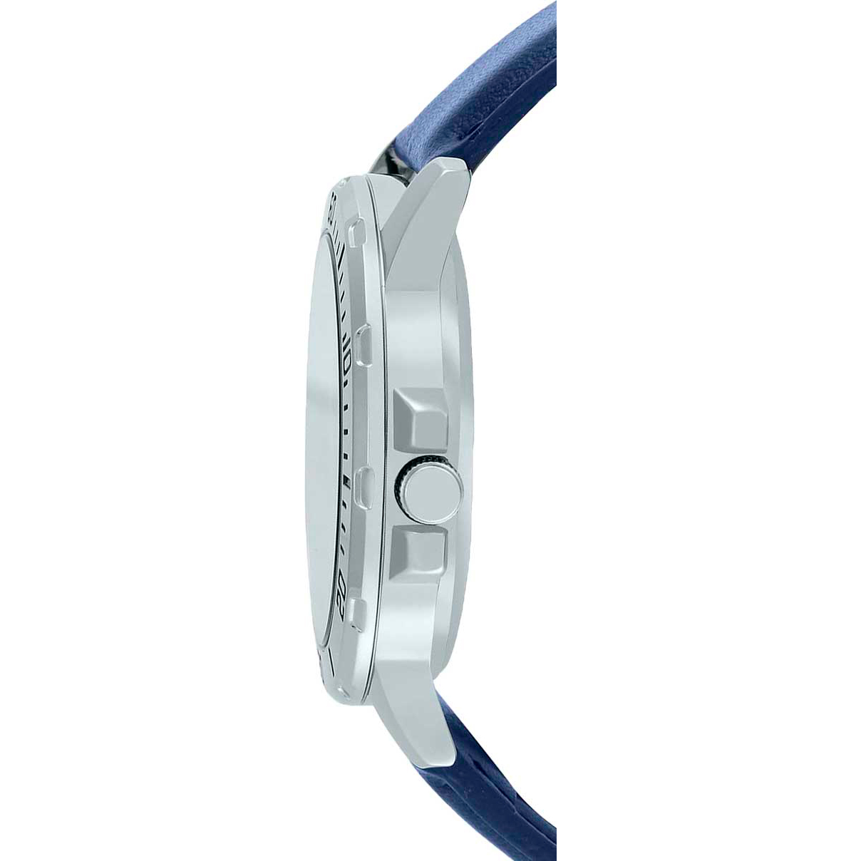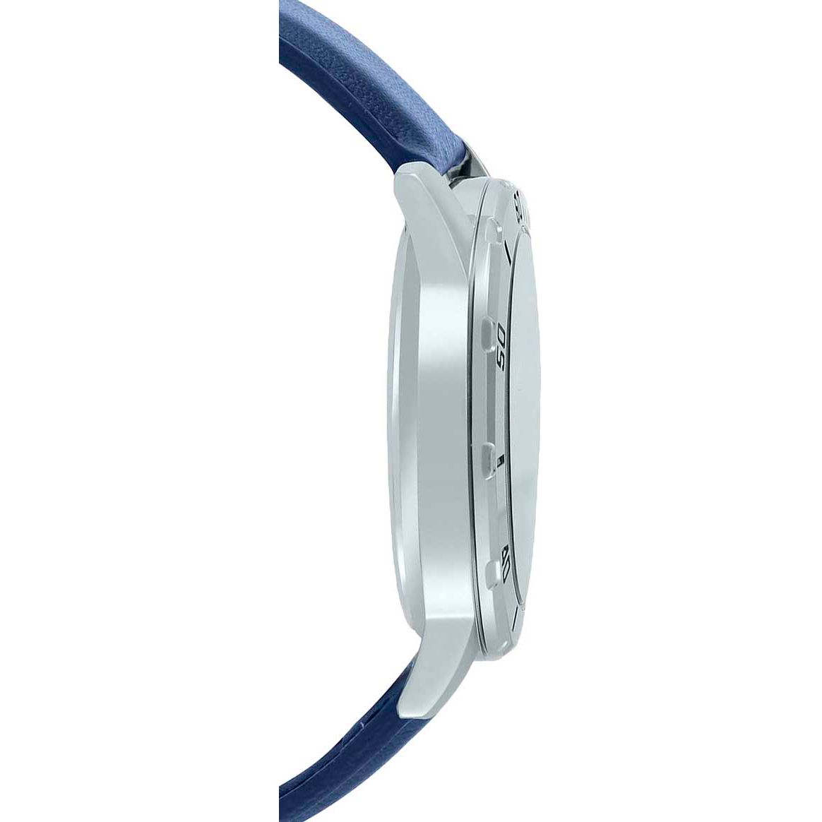 Ремешок: Кожаный ремешок синего цвета с классической застежкой.