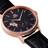 Корпус: Нержавеющая сталь с PVD покрытием цвета розового золота. Сапфировое стекло устойчивое к царапинам. Черный циферблат двухслойный, что придает ему объемный вид и привлекает внимание к движению часовой и минутной стрелок. Прозрачная винтовая задняя крышка. Водозащита - 100 метров. Диаметр 40 мм.