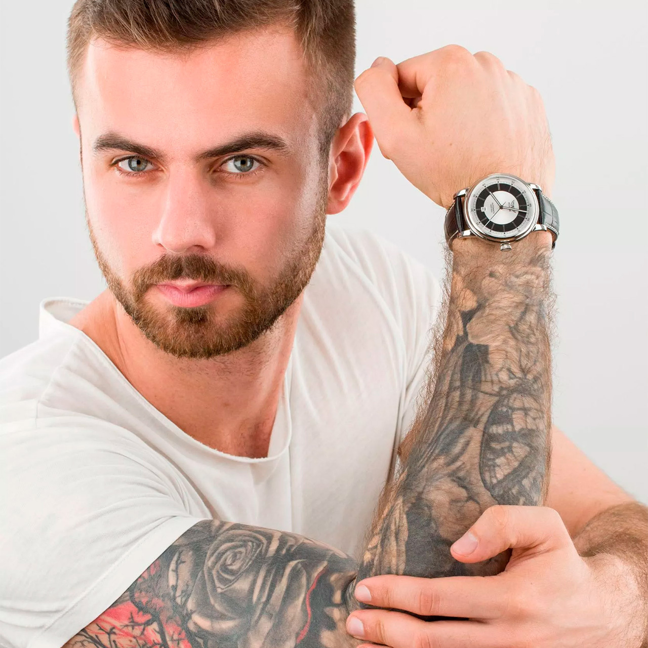 Ремешок: Черный ремешок из телячьей кожи с тиснением под аллигатора. Браслетная застежка из нержавеющей стали, раскладывающаяся при нажатии кнопок двойной блокировки.