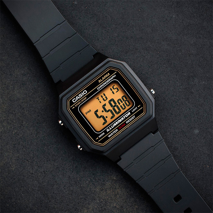 Корпус: Ударопрочный корпус часов сделан из высококачественного пластика чёрного цвета. Пластиковое стекло устойчивое к ударному воздействию. Размер корпуса (Ш x В x Г) 43,1мм x 41,2мм x 10,5мм. Водонепроницаемость: 50 м.