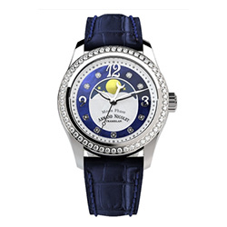 - Циферблат инкрустирован накладными цифрами и индексами, напоминающими бриллианты, а конец секундной стрелки украшен месяцем.