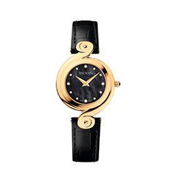 7. Balmain Kerria B4170.32.66 Стальной полированный корпус с жёлто-золотым PVD-покрытием. Чёрный перламутровый циферблат с центральными гранёными стальными, с жёлтой позолотой, стрелками часов и минут, с четырьмя бриллиантами в виде условных индексов. Чёрный ремешок из натуральной кожи с застёжкой из стали с жёлтой позолотой. |