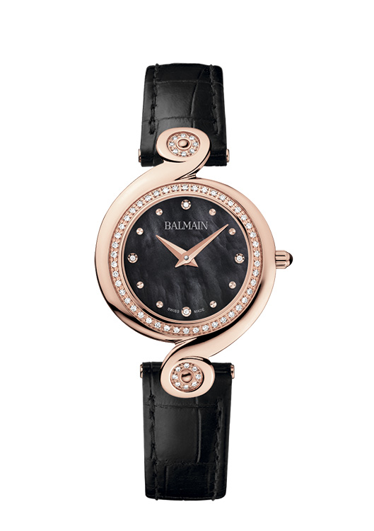13. Balmain Kerria B4179.32.83 Стальной полированный корпус с розово-золотым PVD-покрытием. Белый перламутровый циферблат с центральными гранёными стальными, с розовой позолотой, стрелками часов и минут, с четырьмя бриллиантами в виде условных индексов, с фирменным розово-золотым узором в форме арабески. Чёрный ремешок из натуральной кожи с застёжкой из стали с розовой позолотой. |