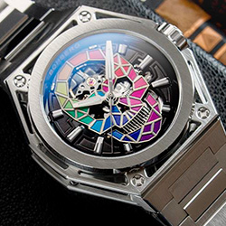 - Циферблат: Скелетонизированный, череп из цветных сегментов.