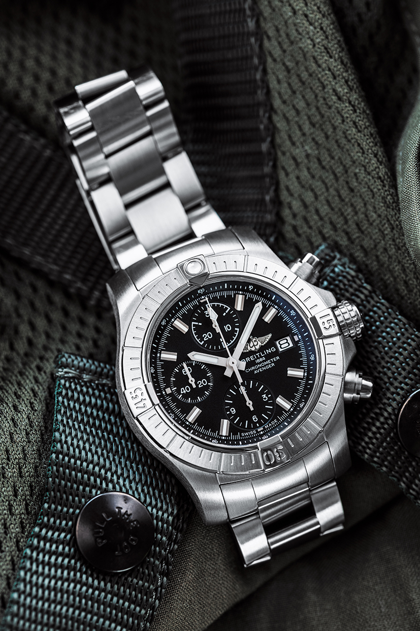 Breitling Avenger Chronograph 45 – классическая модель для пилотов. Эти часы имеют 45-миллиметровый корпус из нержавеющей стали, оснащенный вращающимся в одном направлении безелем с храповым механизмом. Циферблат выполнен в черном или синем цвете. Модель с черным циферблатом предлагается в комплекте с браслетом из нержавеющей стали с раскладной застежкой-клипсой либо кожаным армейским ремешком антрацитового цвета с