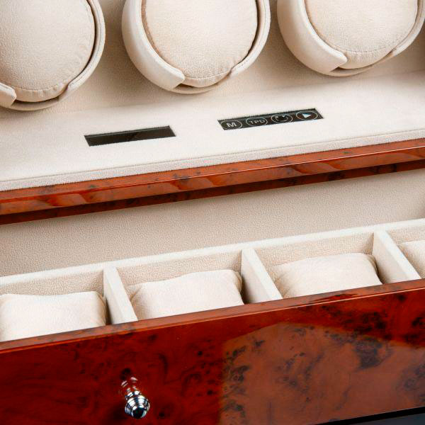 Корпус из натурального шпона капового дерева (Burlwood) придаёт аксессуару изысканный вид, а отделка из велюра внутри обеспечивает бережное хранение коллекции. Благодаря шести независимым программируемым моторам, Watch Winder Basel 6 подходит для большинства автоматических калибров, обеспечивая точность и надёжность работы ваших часов.