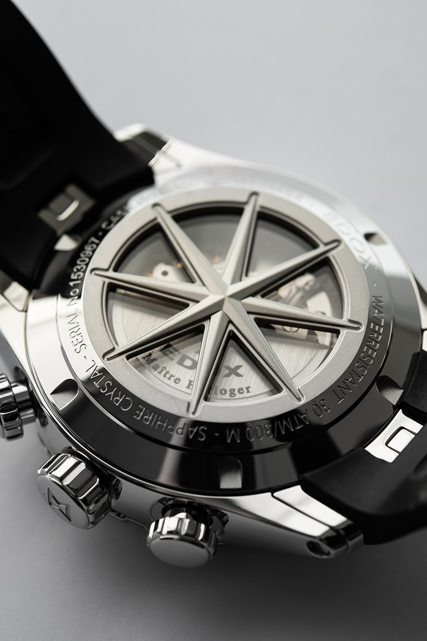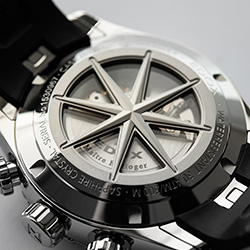 Изящные корпуса из нержавеющей стали с фирменным дизайном Triple Horn напоминают о динамике океанских волн. Обновлённая палитра включает насыщенные синие, чёрные и акцентные фиолетово-синие оттенки - настоящая ода глубинам. А сквозь заднюю крышку с гравировкой "роза ветров" открывается захватывающий вид на работу швейцарского механизма.