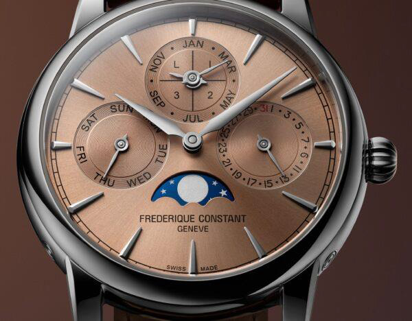 Вечный календарь с индикацией дня, даты, месяца, фазы луны и високосного года органично встроен в дизайн: отображения располагаются в положении 3, 6, 9 и 12 часов, добавляя глубины и симметрии. Сердце модели - мануфактурный калибр FC-776, 34-й по счёту, разработанный Frederique Constant, теперь с запасом хода до 72 часов. Механизм можно наблюдать через прозрачную заднюю крышку из сапфирового стекла.