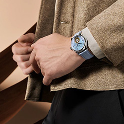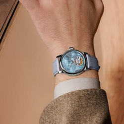 Корпус из 18-каратного белого золота диаметром 39 мм стало воплощением чистоты и сдержанного блеска. Перламутровый циферблат раскрывает мягкие переливы серого и голубого, подчёркивая утончённость турбийона, собранного вручную в женевской мануфактуре.