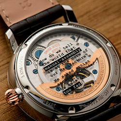 На задней стороне корпуса можно увидеть забавную гравировку, описывающую суть коллаборации: «Как рассказать миру о том, что часы собираются вручную? Мы спросили seconde/seconde/, и он зашел слишком далеко». Сквозь прозрачную заднюю крышку открывается вид на автоматический калибр FC-705 с запасом хода 38 часов, декорированный узорами "Женева" и синими винтами.