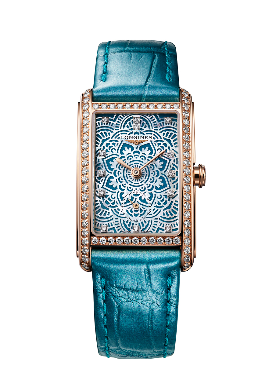Эти часы отличаются прямоугольной формой и вдохновлены моделями 1920-х годов. Новая коллекция воспевает итальянскую «сладкую жизнь» с ее непринужденной изысканностью. Часы The Longines DolceVita Elegance Celebration – Limited Edition украшены бирюзовым циферблатом с перламутровым узором-мандалой и бриллиантовыми индексами. Корпус из розового золота, окаймленный 68 бриллиантами, дополнен бирюзовым кожаным ремешком.