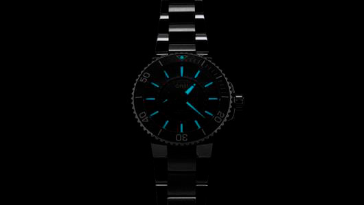 Часы также отличаются необычным круговым указателем даты, который запитывается автоматическим швейцарским механизмом. С их водонепроницаемостью до 30 бар (300 м), часы готовы к любым приключениям в морских глубинах.