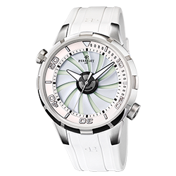 2. Perrelet Turbine Diver A1066/2 Корпус из матовой нержавеющей стали марки «316L»; неподвижный безель с декоративными каннелюрами и четырьмя зажимами. Циферблат с люминесцентным покрытием, центральными белыми люминесцентными стрелками часов, минут и секунд, белой шкалой с чёрными часовыми условными индексами; вращающийся фланец с белой 60-минутной дайверской шкалой, декоративная белая турбина с одиннадцатью лопастями поверх циферблата. Белый каучуковый ремешок с логотипом Perrelet и классической застёжкой из нержавеющей стали. |