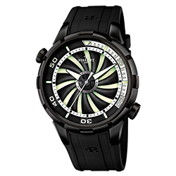 8. Perrelet Turbine Diver A1088/2 Корпус из матовой нержавеющей стали марки «316L» с чёрным PVD-покрытием; неподвижный безель с PVD-покрытием чёрного цвета, декоративными каннелюрами и четырьмя зажимами. Циферблат с люминесцентным покрытием, центральными белыми люминесцентными стрелками часов, минут и секунд, белой шкалой с чёрными часовыми условными индексами; вращающийся фланец с черно-белой 60-минутной дайверской шкалой, декоративная чёрная турбина с одиннадцатью лопастями поверх циферблата. Чёрный каучуковый ремешок с логотипом Perrelet и классической застёжкой из нержавеющей стали с PVD-покрытием чёрного цвета. |