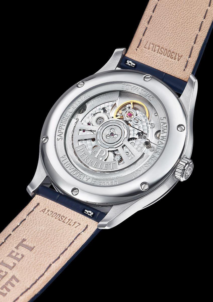 За красотой скрывается надёжность: внутри корпуса работает мануфактурный калибр Perrelet P-321, с частотой 28,800 пк/ч и запасом хода 42 часа. Прозрачная задняя крышка позволяет любоваться тонкой отделкой механизма - гравированными мостами и массивным ротором с логотипом бренда.