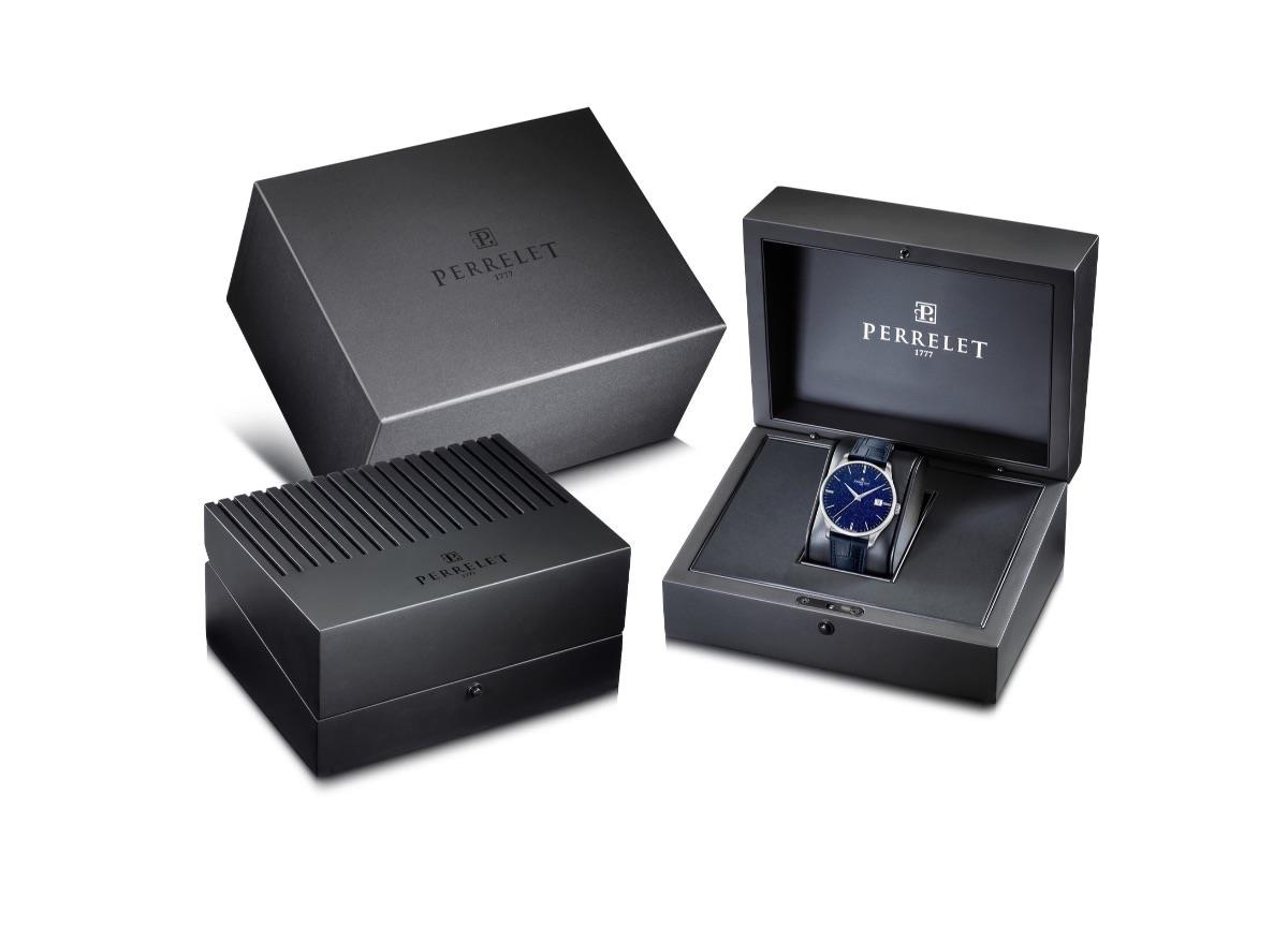 - Ремешок: Синий кожаный, телячья кожа с тиснением под аллигатора, быстрая смена, пряжка с логотипом Perrelet