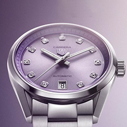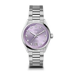 TAG Heuer Carrera Date 36 mm - новая версия культовой Carrera с притягательным лиловым циферблатом: спиральное сатинирование и градиентная разметка добавляют глубины и динамики при любом освещении, а бриллиантовые индексы дают деликатный, но уверенный акцент роскоши. Модель органично сочетает утончённый дизайн и практичную надёжность: выпуклое сапфировое стекло защищает циферблат, а тонко продуманный стальной браслет с H-звеньями обеспечивает комфорт и эффектный силуэт на запястье. Отмеченная сбалансированными пропорциями и аккуратной отделкой, эта Carrera одинаково уместна на деловой встрече, коктейльном приёме или в повседневном гардеробе. Она привлекает взгляд, не бросаясь в глаза.