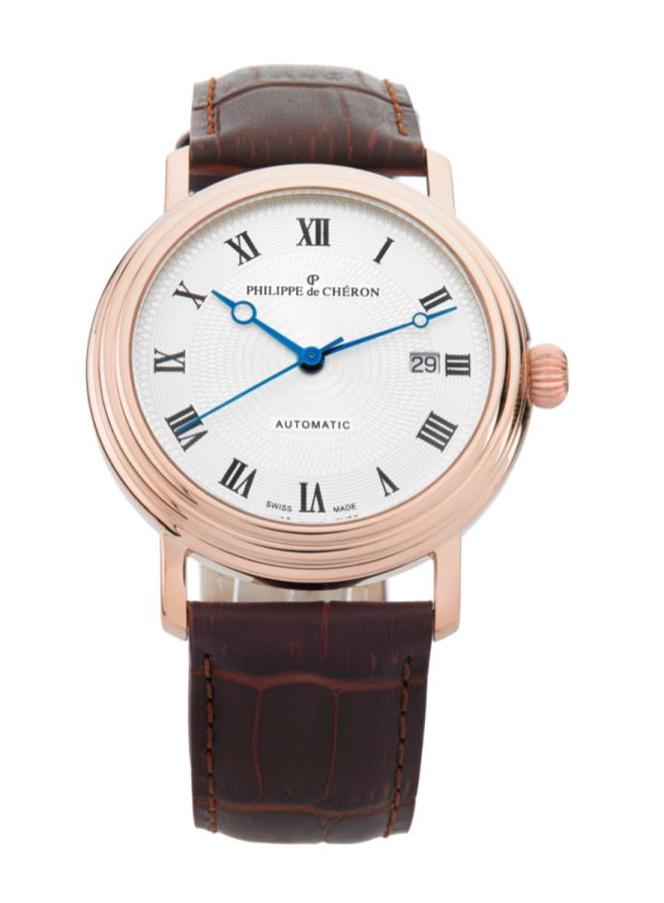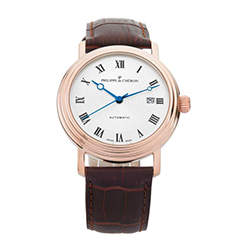 1. Philippe de Cheron Templar automatic 1003.2262N Корпус – красное золото 14 карат, общий вес золота – 34,8 г. Диаметр – 41мм, толщина – 9 мм. Сапфировое стекло. Механизм с автоподзаводом «ETA 2824». Циферблат – серебристый, guilloché, золотые стрелки, чёрные римские (I-XII) цифры, окошко даты. Водонепроницаемость 3 атм. (30 м). Коричневый кожаный ремешок. |
