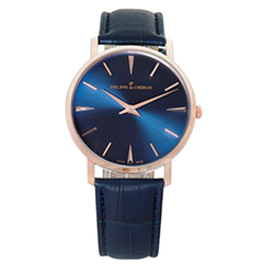 3. Philippe de Cheron Crusader II quartz 1004.1265N Корпус – красное золото 14 карат, общий вес – 20,6 г. Диаметр – 40 мм, толщина – 5,5 мм. Сапфировое стекло. Механизм кварцевый «Ronda 1015». Циферблат – синий, Clous de Paris, золотые стрелки и часовые метки, окошко даты. Водонепроницаемость 3 атм. (30 м). Синий кожаный ремешок. |