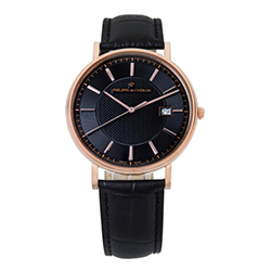 2. Philippe de Cheron Crusader II quartz 1004.1267N Корпус – красное золото 14 карат, общий вес – 20,6 г. Диаметр – 40 мм, толщина – 5,5 мм. Сапфировое стекло. Механизм кварцевый «Ronda 1015». Циферблат – чёрный, Clous de Paris, золотые стрелки и часовые метки, окошко даты. Водонепроницаемость 3 атм. (30 м). Чёрный кожаный ремешок. |