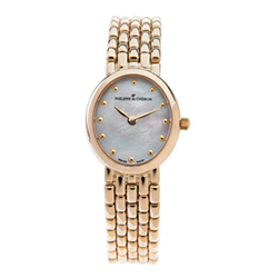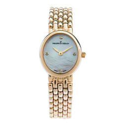 3. Philippe de Cheron Elisa oval quartz 5002.1213N Корпус – жёлтое золото 14 карат, размеры – 21,5x24мм, толщина – 5,5мм. Браслет – жёлтое золото 14 карат. Общий вес золота – 40,2 г. Сапфировое стекло. Водонепроницаемость 3 атм. (30 м). Механизм – кварцевый «Ronda 751». Циферблат – белый, перламутровый, золотые стрелки и часовые метки. |