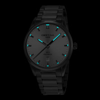 Корпус: Корпус модели выполнен из высококачественного титана с повышенной устойчивостью к коррозии, магнитным полям и морской воде. Поверхности с матовой шлифовкой – сатинированием и полировкой до зеркального блеска. Циферблат серого цвета выполнен по технологии Sunray (солнечные лучи). Заостренные прямоугольные стрелки в стиле Baton. Метки в виде штрихов. Метки и стрелки с люминесцентным покрытием, которое светится в темноте после непродолжительной зарядки на свету. Сапфировое стекло. Диаметр: 40 мм. Водостойкость: 100 м.