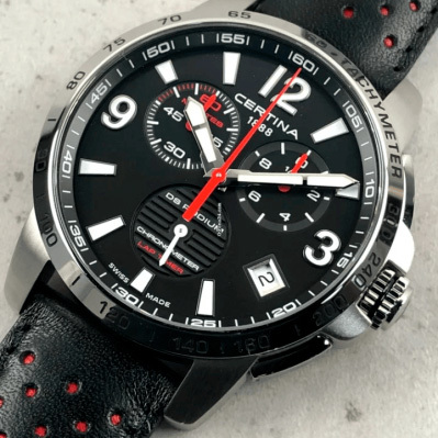 Функции: Индикация часов, минут при помощи центральных стрелок. Маленькая секундная стрелка в позиции "6 часов". Дата в положении "4 часа". Хронограф. Тахиметр.
