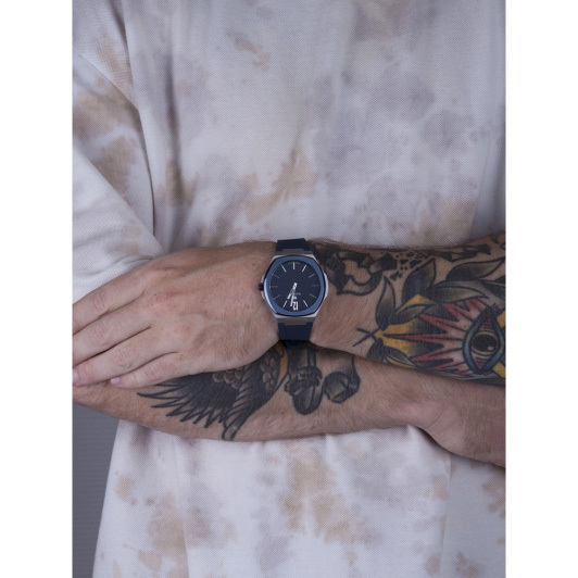 Корпус: Круглый корпус выполнен из нержавеющей стали. Циферблат синего цвета с метками в виде штрихов, надежно защищен минеральным стеклом. Заводная головка с защитой. Диаметр корпуса 44 мм. Водонепроницаемость 50 метров.