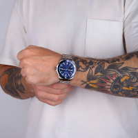 Корпус: Круглый корпус выполнен из полированной нержавеющей стали. Синий циферблат. Накладные часовые индексы выполнены из стали. Стрелки с покрытием SuperLuminova, которое обеспечивает подсветку в темное время суток. Минеральное стекло. Рифленая заводная головка. Диаметр корпуса составляет 46 мм, толщина 12 мм. Водостойкость WR 50 (мытье рук, дождь).