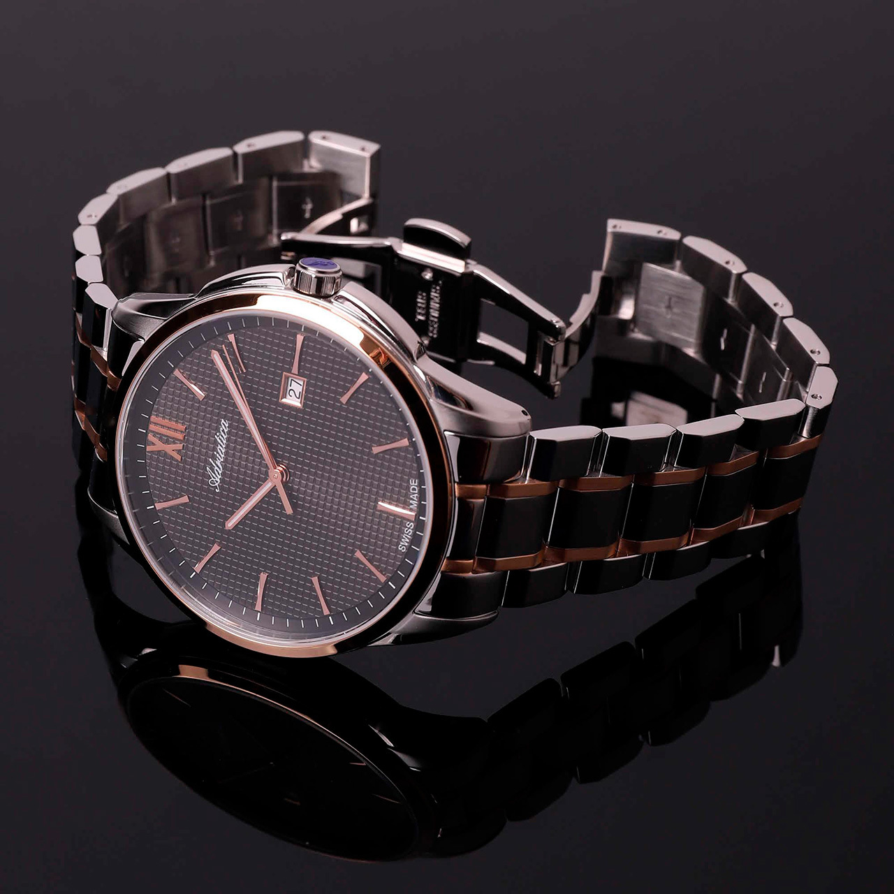 Ремешок: Браслет выполнен из нержавеющей стали с частичным PVD покрытием розового золота, поверхности с различными видами финишной обработки. Браслетная раскладывающаяся застежка с дополнительным защитным фиксатором, гравировка с названием марки и ее эмблема.