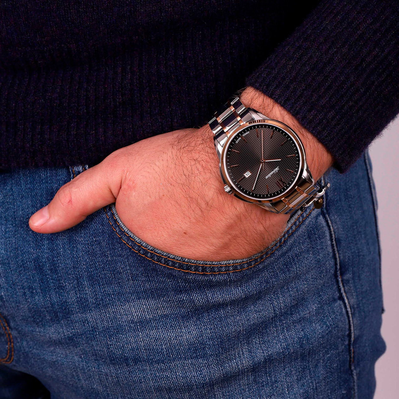 Корпус: Круглый корпус выполнен из полированной нержавеющей стали с частичным PVD покрытием розового золота. Чёрный циферблат с узором гильоше. Метки в виде штрихов и римской цифры 12. Стрелки с покрытием SuperLuminova, которое обеспечивает длительную подсветку в темное время суток. Устойчивое к возникновению царапин и потертостей сапфировое стекло. Заводная головка с защитой. Диаметр корпуса составляет 45 мм, толщина 9 мм. Водостойкость WR 50 (мытье рук, дождь).