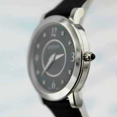Корпус: Нержавеющая сталь, сапфировое стекло. Циферблат перламутровый черный, украшен 8 бриллиантами. Диаметр 29 мм. Водонепроницаемость 50 метров.