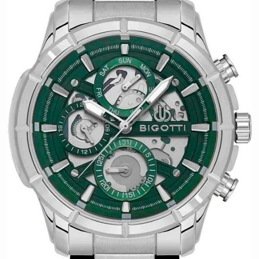 Корпус: Стильные мужские часы со скелетонизированным циферблатом. Корпус изготовлен из латуни и имеет надёжное износостойкое покрытие серебристого цвета. Циферблат зелёного цвета. Часовые индексы и стрелки с люминесцентным покрытием. Прочное минеральное стекло обеспечит защиту часов от повреждений. Диаметр: 44 мм. Водонепроницаемость: 50 м.