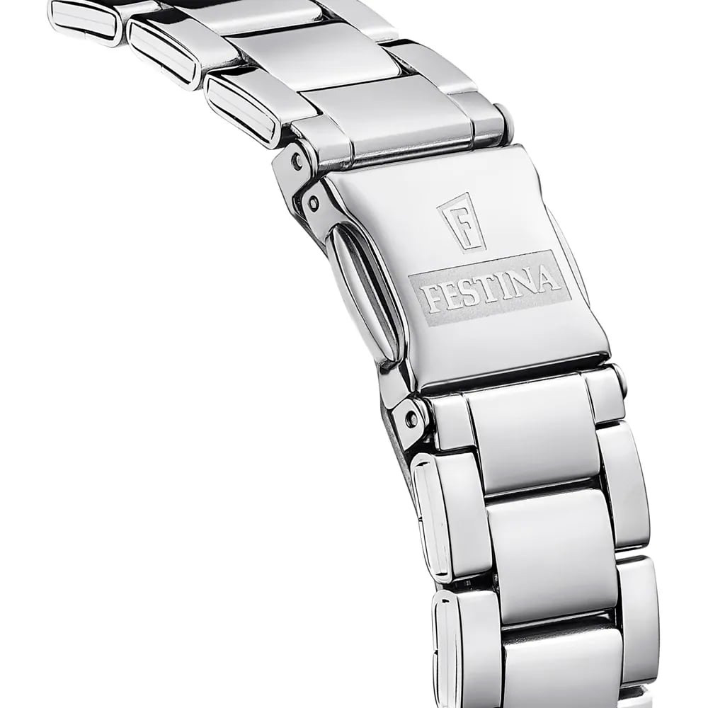 Ремешок: Надежный стальной браслет с раскладывающейся застежкой, которая украшена фирменным логотипом Festina.