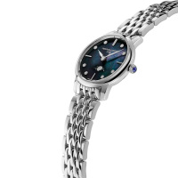 Корпус: Корпус выполнен из нержавеющей стали. Перламутровый циферблат с часовыми индексами в виде штрихов и точек, украшен 8 бриллиантами 0,04К. Устойчивое к возникновению мелких механических повреждений сапфировое стекло. Заводная головка украшена камнем в форме кабошона. Диаметр корпуса 30 мм, толщина 8 мм. Водостойкость: 30 м (WR 30).